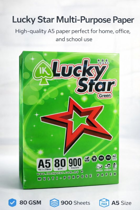 Lucky Star A5 80gsm Multi-Purpose Paper is a high-quality, smooth-finish printing paper designed for everyday office, school, and home use. With a standard 80gsm weight, it delivers sharp, clear prints and reliable performance in laser printers, inkjet printers, photocopiers, and fax machines.