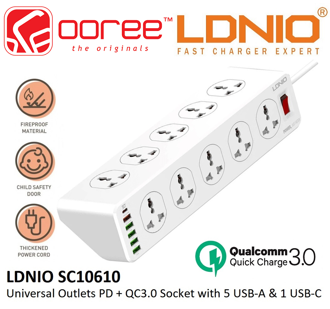 The LDNIO SC10610 PD & QC3.0 Power Socket (10-Port) is a premium power management solution designed for high-performance and fast charging. Equipped with multiple AC outlets and advanced USB ports featuring PD (Power Delivery) and QC3.0 (Quick Charge 3.0) technology, this power socket allows you to charge and power up to 10 devices simultaneously with maximum efficiency.