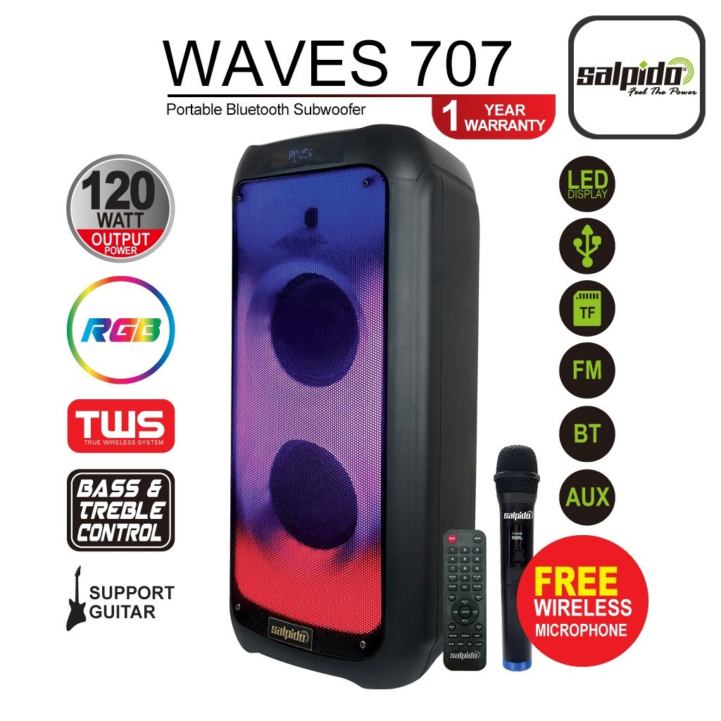 Turn up the volume on your next gathering with the Salpido WAVES 707, a powerful dual 8" outdoor party speaker designed to deliver bold, immersive sound and a complete entertainment experience. With 100W output power, LED flame lights, and support for wireless microphones and guitar input, it’s the ultimate all-in-one party companion.