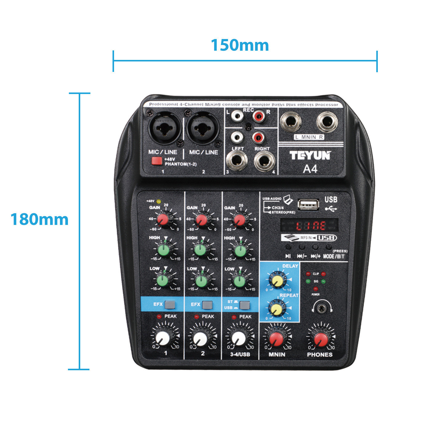 One of the standout features of the A4 is its Bluetooth connectivity, which allows wireless audio streaming from smartphones, tablets, or laptops. This is ideal for background music, playback tracks, or on-the-fly setups without cables. Additionally, the mixer doubles as a USB audio interface, enabling direct recording or streaming from a computer. It also supports audio playback and recording from USB flash drives, making it a versatile solution for both digital and analog workflows.